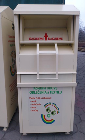 NA TRIEDENIE TEXTILU POUŽITÉ ZBERNÉ KONTAJNERY.