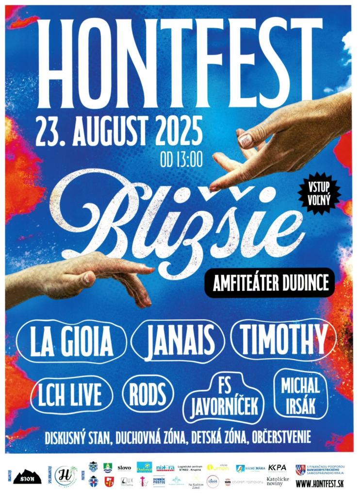 23.augusta od 14:00 sa na amfiteátri v Dudinciach uskutoční kresťanský festival HONTfest. Tešiť sa môžete na hudobné vystúpenia kapiel La Gioia, Janais, Timothy či Lamačské chvály. V diskusnom stane sa môžete zapojiť do zaujímavých diskusií s hosťami ako Max Kašparu, sestrou Lamiyou a mnoho ďalšími