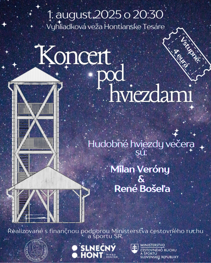 Obec Hontianske Tesáre Vás srdečne pozýva na Koncert pod hviezdami, ktorý sa uskutoční 1. augusta 2025 o 20:30 pri Vyhliadkovej veži v Hontianskych Tesároch.