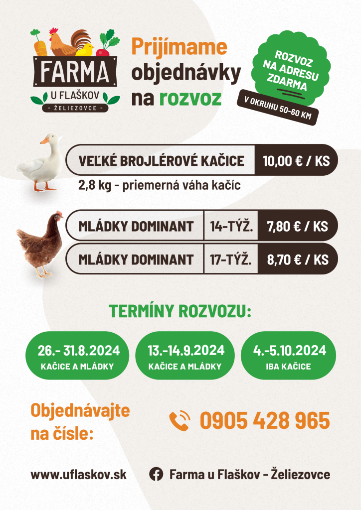 Farma u Flaškov Želiezovce prijíma objednávky na rozvoz hydiny. Termín rozvozu je bližšie uvedený na plagáte. Objednávky sú prijímané na čísle: 0905428965